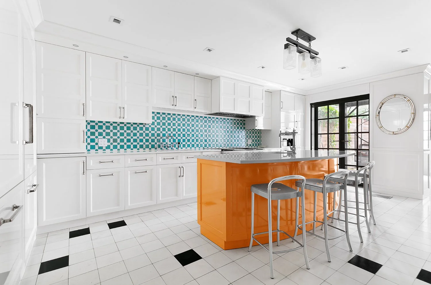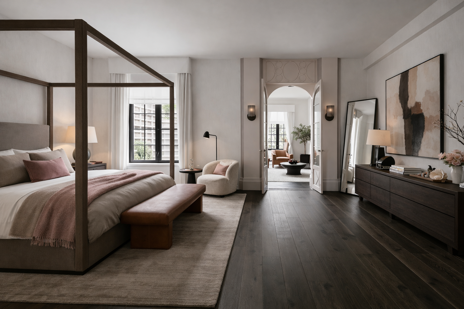 At the garden level, daily living is anchored by a fully appointed kitchen with custom millwork, integrated appliances, and a central island. The adjoining dining area within the rear extension opens directly to a landscaped garden of approximately 600 square feet. Designed for both quiet use and entertaining, the outdoor space incorporates an outdoor kitchen, layered seating, and architectural planting. A separate suite with private entrance offers flexibility for guests, staff, or workspace.