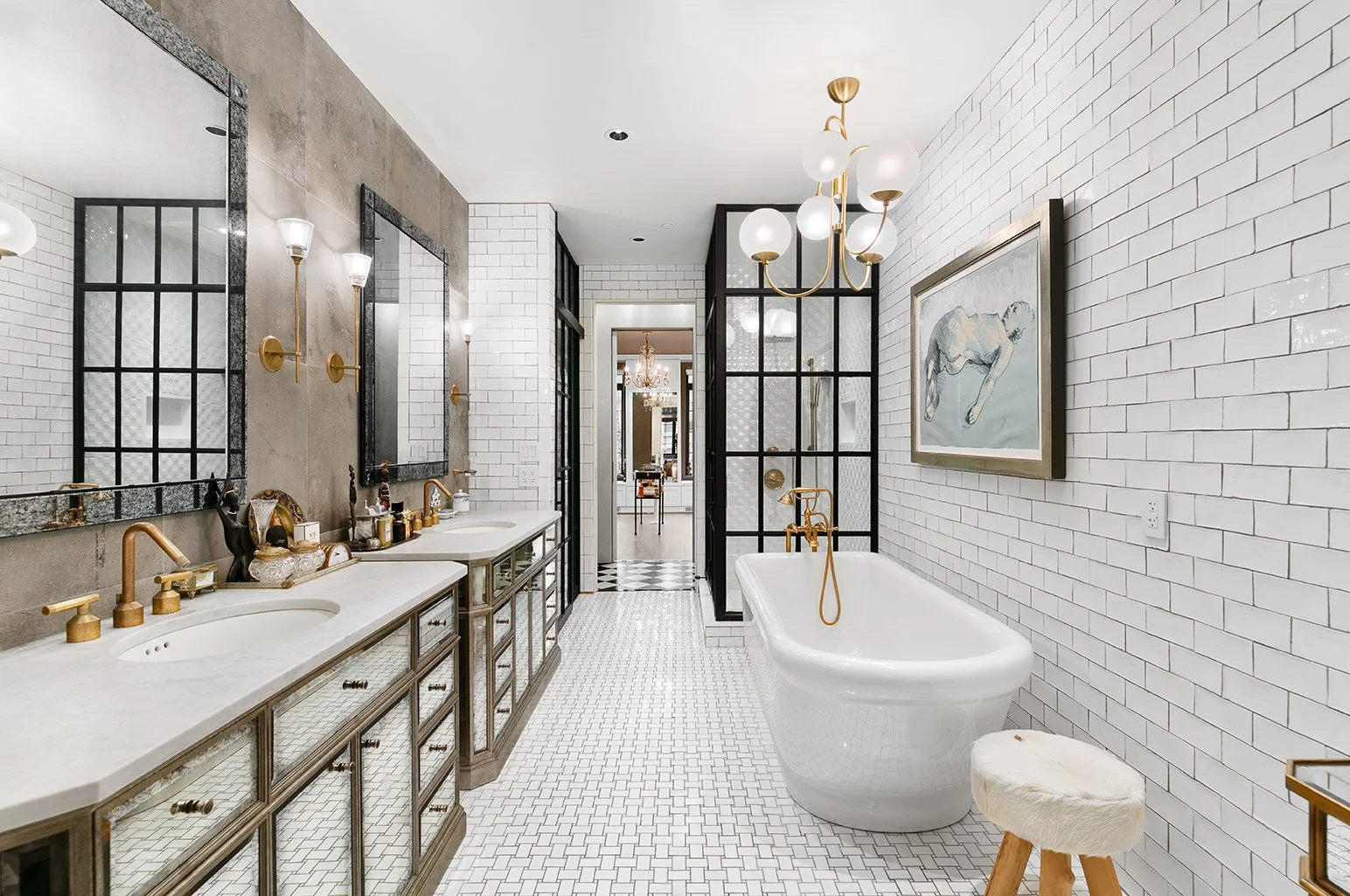 The primary suite, occupying the full third floor, is arranged as a private suite within the home. A rear-facing bedroom overlooking the garden is complemented by a charming sitting room. The hotel-style en suite bath is proportioned and detailed with dual vanities, soaking tub, and glass-enclosed shower. An expansive front boutique-like dressing room completes the experience.
