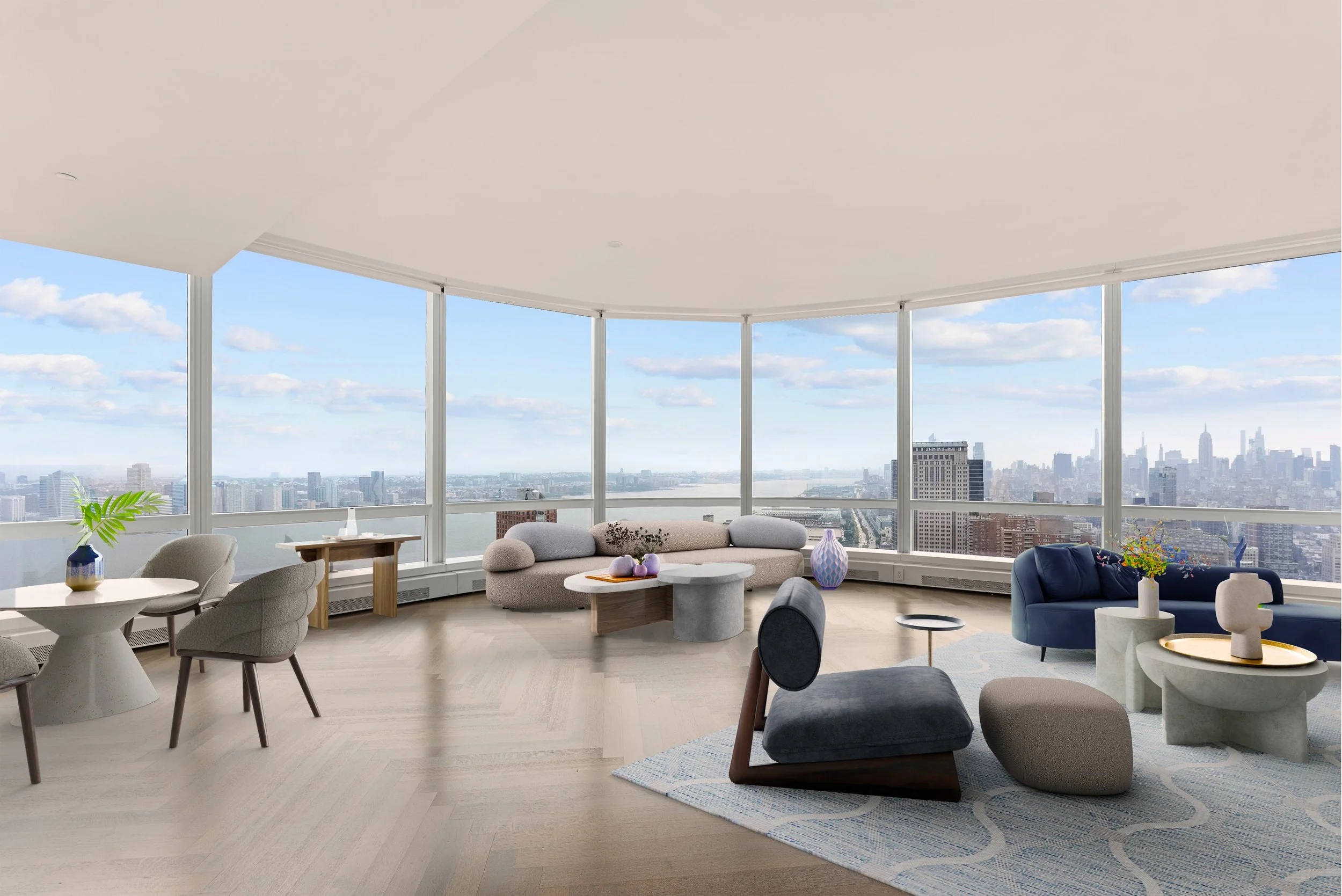Upon entering this extraordinary home, you are greeted by a sprawling gallery that extends north to south, proving expansive wall space for your art collection. The north wing leads into a voluminous and spacious open-concept living space where floor-to-ceiling windows bathe the entire residence in natural light, offering panoramic vistas of the iconic New York City skyline, the Hudson River, and surrounding landmarks.