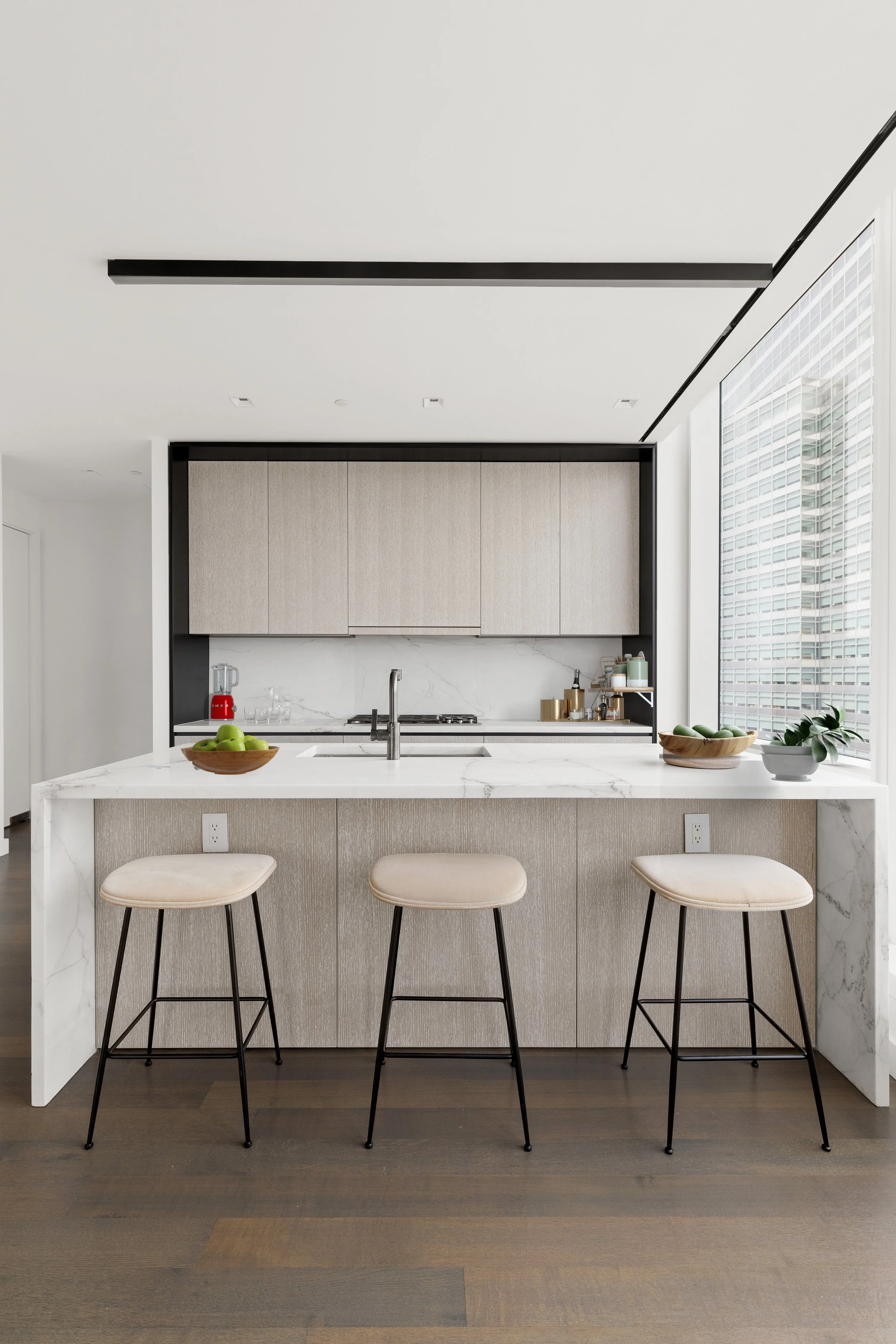 The well-appointed Molteni chef's kitchen is a true masterpiece showcasing fresh-looking but crisp custom white oak cabinetry, and a generous marble center island with breakfast bar that's perfect for entertaining guests or enjoying a casual meal. It is fully equipped with top-of-the-line appliances (Wolf, Miele & Sub-Zero) and a host of conveniences including two pantries, a 30-in. refrigerator, 18-in. freezer, five-burner gas cooktop with built-in vented hood, dishwasher, wall oven with warming drawer, steam + convection speed oven, wine refrigerator plus a built-in coffee system. The adjoining dining area provides an elegant space for hosting lavish dinner parties or intimate gatherings with friends and loved ones.